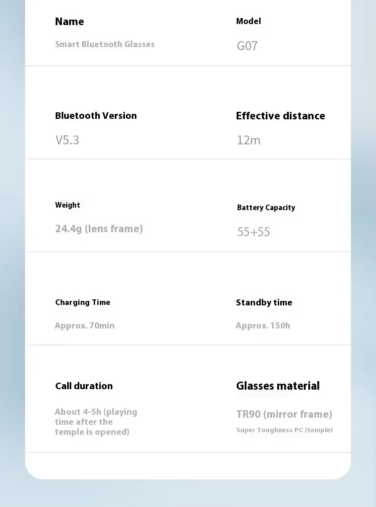 Battery Capacity | 3.7V/55mAh/Sunglasses |