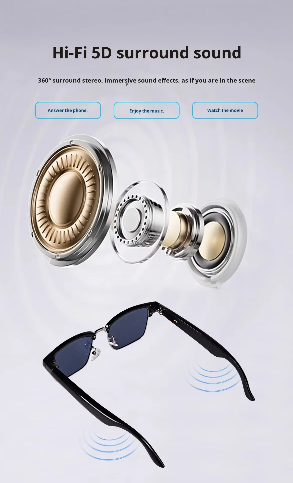 speclficatlon | Bluetooth chip: AB5656D3 Waterproof level: iP4 Operation mode: Button (single button)Compatible systems: i0S/Android/Windows Connection parameters: 5.4 Battery type. Polymer lithium battery Speaker specifications中15.4mm 22 ohms copper ring titanium film Battery capacity: 100mAh Charging method: Type-c usB charging port Charging time. 2.5hours Battery life: 5 hours Appearance material: ABS + PC, spray oil matte UV Lens. AC lens Frame/leg: Black, Lens. sunglassesgradient yellow, gradient blue |